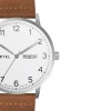 This model uses a stainless steel case with white dial on a tan flat leather strap. The date window shows the day of the week and date.