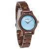 The Pearl Petite Walnut Sky features an iridescent sky blue mother of pearl dial detailed with white diamonds as numbers, framed with an elegantly minimal case and band made from all natural walnut wood.